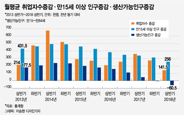 생산가능인구로 불리는 15~64세 연령의 인구 증감 추이를 보더라도 2011년 39만6000명 증가로 고점을 찍은 후 지속적으로 하락해 지난해 2만1000명 증가하는 데 그쳤고, 올해 상반기 생산가능인구는 오히려 전년 동기 대비 6만1000명 감소했다.