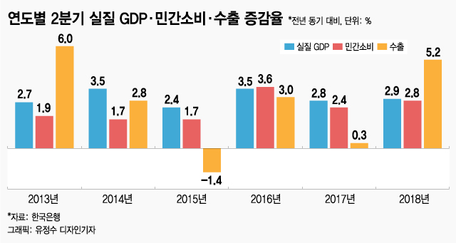 전년 동기 대비 성장률을 보더라도 이러한 사실은 확인된다. 2013년 2분기 성장률은 전년 동기 대비 2.7%, 2014년은 3.5%, 2015년 2.4%, 2016년 3.5%. 2017년 2.8%를 기록했다. 2018년 2분기는 지난해보다 0.1%포인트 높은 2.9%를 기록했고, 5년 평균치인 3.0%와 비교해도 불과 0.1%포인트 낮은데 이를 갖고 '침체' 또는 '부진'이라고 평가하는 것은 과장된 주장이다.