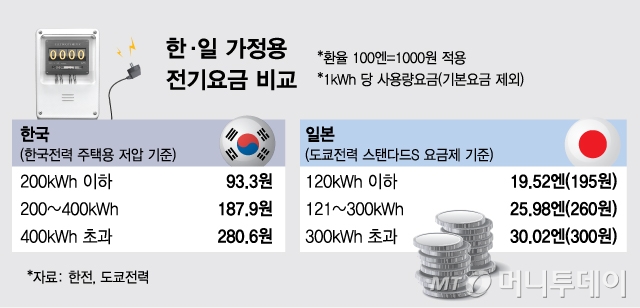 도시거주 4인 가구의 월평균 사용량 350㎾h 기준 한국에선 5만5000원, 일본(도쿄전력 스탠다드S 요금 기준)에선 9400엔(9만4000원)의 요금이 부과된다. 500㎾h를 사용했을 땐 한국 10만4000원, 일본 1만4000엔(14만원), 700㎾h 사용시 한국 16만8000원, 일본 2만엔(20만원) 수준이다.