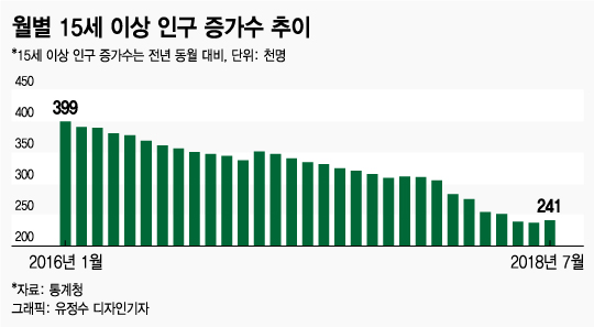 인구추계(중위 추계)에 의하면 국내 인구 증가률은 1996년 0.95%로 떨어진 이후 2002년 0.58%, 2017년 0.39%로 해마다 급격히 줄었다. 최근 15세 이상 인구 증가수를 봐도 2016년 1월 전년 동월 대비 39만9000명 증가에서 올 7월 24만1000명 증가로 지속적으로 감소하고 있다.