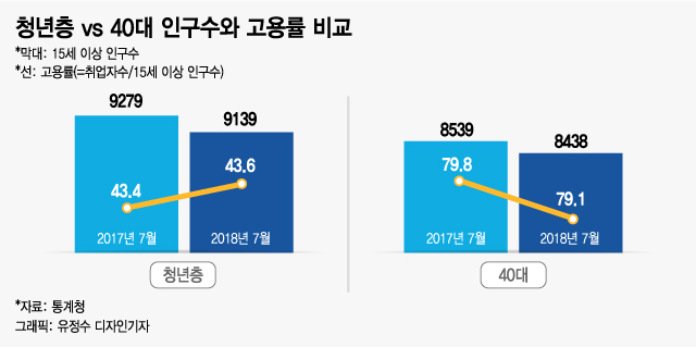 그러나 40대의 취업문제는 인구감소를 고려하더라도 청년층에 비해 더 심각한 상황이다. 7월 40대 고용률은 79.1%로 전년 동월의 79.8%에 비해 0.7%p나 하락했고, 실업률은 2.5%로 역시 작년 1.9%에 비해 0.6%p 상승했다.