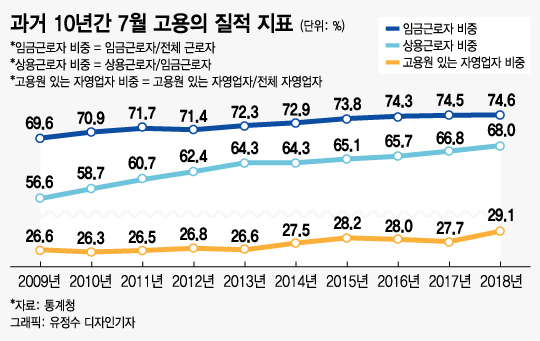 올 7월 전체근로자(임금근로자+비임금근로자) 중 임금근로자 비중은 74.6%로 과거 10년간 가장 높다. 비임금근로자(자영업자+무급가족종사자)가 줄고 임금근로자가 늘어난 결과다. 임금근로자(상용직+임시직+일용직) 중 상용근로자 비중도 최고 수준(68.0%)이다.