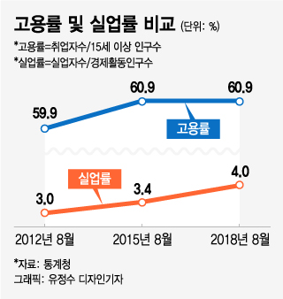 2015년 8월은 고용률이 60.9%, 실업률은 3.4%였다. 올해와 고용률이 같고 실업률은 낮았지만 고용의 질은 떨어졌다. 올해보다 상용근로자·고용원 있는 자영업자는 102만4000명 적었고 임시근로자·일용근로자·고용원 없는 자영업자는 45만1000명 더 많았다.
