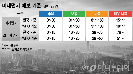 현재 지름 10㎍ 이하인 미세먼지(PM10)의 경우 △좋음 0~30㎍/㎥ △보통 31~80㎍/㎥ △나쁨 81~150㎍/㎥ △매우 나쁨 151㎍/㎥ 이상으로 예보한다. 2.5㎍(PM2.5)보다 작은 초미세먼지는 △좋음 0~15㎍/㎥ △보통 16~35㎍/㎥ △나쁨 36~75㎍/㎥ △매우 나쁨 76㎍/㎥ 이상 등으로 표시한다.