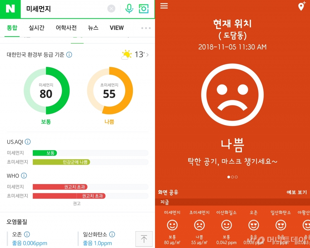 #기관지가 약한 김현지(가명·38)씨는 마스크없이 아침 출근길에 나섰다가 연신 기침을 콜록였다. 희뿌연 하늘 상태로 봐선 미세먼지 탓인 듯했다. 스마트 폰으로 포털사이트를 열어 미세먼지를 검색해보니 한국환경공단 에어코리아에서 제공한 예보는 '보통'(62㎍/㎥)이었다. 그런데 회사 근처에서 만난 직장동료는 "오늘같은 날 왜 마스크를 안했어. 기관지도 않좋다면서"라며 놀라는 눈치였다. "포털사이트에서 괜찮다고 해서"라고 하자 동료직원은 "환경부 기준으로 봤구나. WHO 기준으로 봐야지. 이거 봐바 '나쁨'이라고 나오잖아. 마스크 했어야지"라고 말했다.