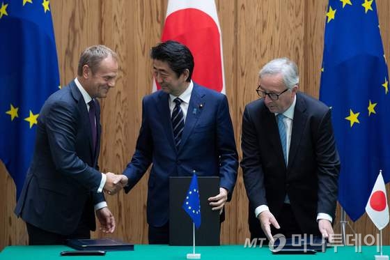 문제는 새 통상협정이 제3국인 한국에 미칠 영향이다. 한국은 2011년 한-EU FTA 발효 이후 무관세 혜택을 누려왔다. 그런데 EU가 일본에 높은 수준으로 상품 시장을 개방하면서 일본도 EU시장에서 특혜관세 혜택을 받을 수 있게 됐다. 한국 기업들은 이제 EU시장 내에서 가격 경쟁력이 더 높아진 '라이벌' 일본과 승부를 벌여야 한다.