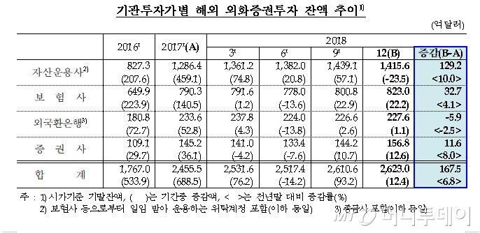 자산운용사 투자잔액 증가규모가 129억달러로 가장 많았다. 보험사(33억달러)와 증권사(12억달러)가 뒤를 이었다. 반면 외국환은행 투자잔액은 6억달러 감소했다.
