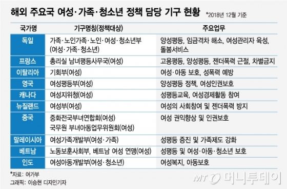해외는 어떨까. 다른 나라에는 거의 없는 여가부가 한국에만 있다는 잘못된 정보가 많다. 여가부에 따르면 지난해 12월 기준 여성, 가족, 청소년 정책을 담당하는 별도의 전담기구가 있는 해외 국가는 30개국이다. 덴마크 등 일부(3개국)는 가족, 청소년만 담당한다.