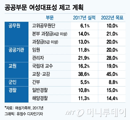 공공부문에서 여성임원 비율을 높이겠다는 정책이 존재하는 것은 사실이지만 실제로 현장에서 적용되고 있지는 않다. 정부는 2017년 11월 공공부문 여성대표성 제고 5개년 로드맵을 발표하고 여성 고위 공무원 비율을 10%, 공기업 등 공공기관 여성임원 비율을 20%로 높이겠다고 발표했다.