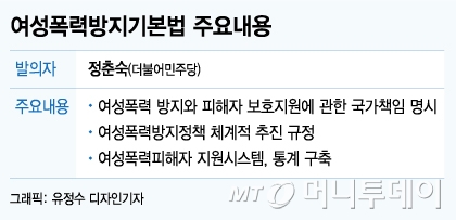 발의자인 정춘숙 더불어민주당 의원도 당초 여성폭력이 아닌 젠더폭력으로 폭력을 규정했다. 남성을 포괄하는 개념이었으나 축소된 것이다.