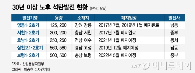 20일 산업통상자원부에 따르면 현재 가동 30년이 넘은 노후 석탄발전은 삼천포 1·2호기, 호남 1·2호기, 보령 1·2호기로 총 6기다. 정부는 미세먼지 저감 대책의 일환으로 이들의 조기 폐지 방안을 검토 중이다. 삼천포 1·2호기는 올해 12월, 호남 1·2호기는 2021년 1월, 보령 1·2호기는 2022년 5월 순차적으로 폐지할 예정이었는데 이를 더 앞당기겠다는 것.