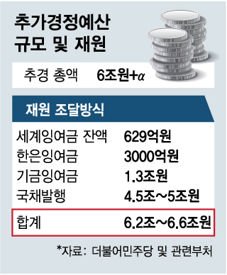 이를 다 끌어모으면 1조6000억원 이상 동원이 가능하다. 모자라는 추경 재원은 적자국채 발행으로 충당한다. 3월말 기준 적자국채 발행 가능한도는 약 17조7000억원 수준인 만큼 여력은 충분하다.