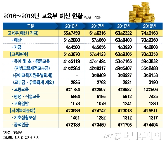 11일 교육부에 따르면 올해 예산(70조2360억원)과 기금(4조6803억원)을 합친 총예산 규모는 74조9163억원이다. 교육부 예산은 해마다 늘고 있다.