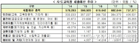 아울러 지난해 지방교육재정 세출예산을 보면 교사·교육전문직·학교회계직 등에 대한 인건비를 포함해 경직성이 강한 경비(물건비·이전·자본·상환 지출)가 80%에 달하고 있는 반면 학교회계 전출금과 예비비 등 기타항목이 20% 수준에 그쳐 실제 가용예산이 많지 않다는 점도 고려사항이다.