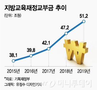 11일 기획재정부와 교육부에 따르면 올해 지방교육재정교부금은 51조1733억원으로 지난해보다 8.5% 늘었다. 내국세 20.46%를 배정하고 있는데 국세수입이 늘어나면 교부금 액수도 같이 늘어난다. 2015년 38조1380억원이었던 것이 2016년 39조8394억원, 2017년 42조663억원, 2017년 47조1502억원 등으로 급격히 증가하고 있다.