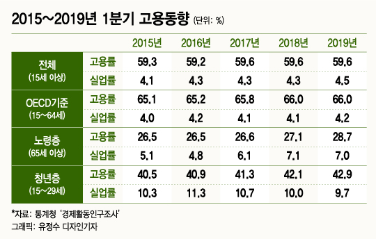 고용동향 기간을 넓혀 2015~2019년 5년간 1분기를 분석하면 청·장년층(15~64세), 노령층(65세 이상)의 고용률과 실업률이 동반상승한 결과가 나온다. 이는 저출산·고령화에 따른 연령별 인구수 변동과 노인들의 경제활동참가율이 높아진 영향 때문이다.