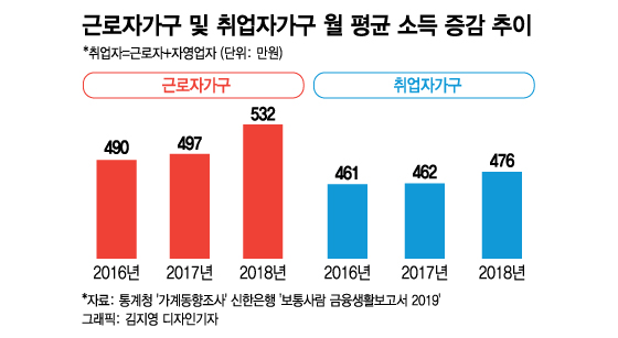 또한 지난해 취업자의 가계소득 증가율은 경제성장률(2.7%)을 상회한 것으로 나타났다. 이는 문재인 정부의 소득주도성장의 정책적 효과가 근로자와 자영업자가구 모두에 뚜렷하게 나타났음을 보여준다. 최근 수년간 근로자와 자영업자의 가계소득 증가율은 경제성장률에 크게 못 미치며 성장에 비해 분배가 적었었다.?(☞관련기사: 가계소득 증가, 6년 만에 경제성장률 상회…실질소득도 증가세 전환)?