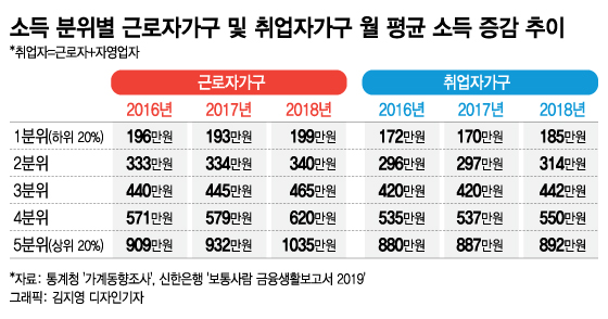 그리고 신한은행 보고서에 따르면 지난해 중산층 이하 취업자가구의 소득증대가 고소득층에 비해 커 소득계층간 격차가 줄어든 것으로 나타났다. 소득 하위 20%(1분위)에서 상위 20%(5분위)까지 가계소득 증가율을 보면 ▷1분위 8.8% ▷2분위 5.7% ▷3분위 5.2% ▷4분위 2.4% ▷5분위 0.6%로 중산층 이하 취업자가구의 소득증대가 상대적으로 컸던 것으로 나타났다. 이는 직전년도에 1분위 취업자 가계소득이 1.2% 감소하고 5분위는 0.8% 증가하면서 소득격차가 벌어진 것과 대조되는 모습이다. 이로써 소득 최상위와 최하위 취업자가구간의 소득격차율은 2016년 5.1배, 2017년 5.2배에서 지난해 4.8배로 줄어들었다.