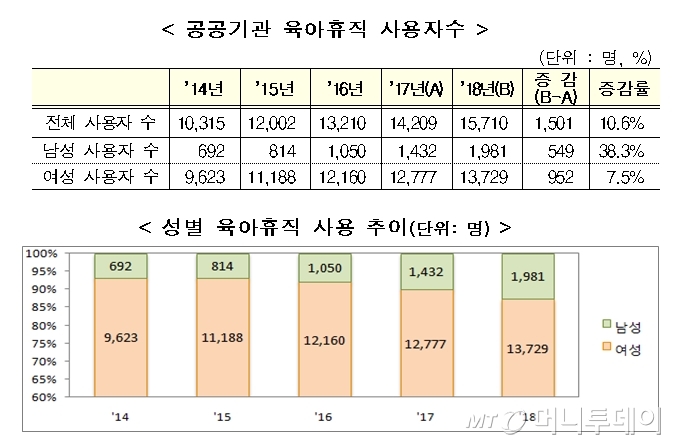 정부는 유아휴직 사용자 가운데 남성 임직원이 총 549명으로 전년에 비해 38.3%나 늘어난 점이 고무적이라고 설명했다. 전체 육아휴직자 가운데 아직은 3.49% 수준에 머물고 있지만 전년에 비해서는 약 40% 가까이 늘어난 수치다.