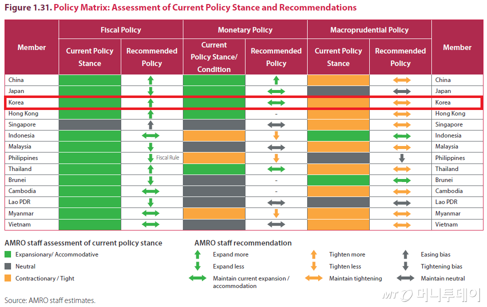 암로는 현재 한국 재정정책이 '확장적', 통화정책은 '완화적'이라고 평가했다. 정책권고 부문에서는 재정정책은 '더 확장적', 통화정책은 '현재 완화기조 유지' 의견을 냈다.