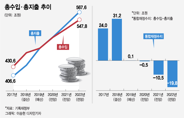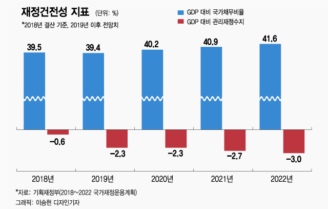 거두는 세금보다 복지에 필요한 지출이 빠르게 늘어나면 재정수지는 적자로 돌아선다. 일단 올해 추경안을 반영한 통합재정수지(총수입 - 총지출)는 1000억원 흑자 수준이지만 내년엔 5000억원 적자로 돌아서고, 적자 폭은 10조5000억원(2021년), 19조8000억원(2022년)으로 늘어날 전망이다. 관리재정수지(통합재정수지 - 기금운용수지) 적자 폭은 문 대통령 임기 말(2022년) GDP 대비 3%에 달한다.