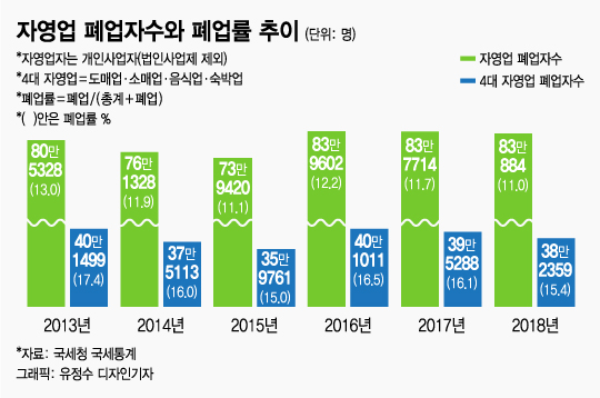 2018년 자영업 신규사업자는 124만2756명으로 전년보다 8만3000명 가량 늘었다. 반면 폐업자수는 83만884명으로 전년보다 7000명 가량 줄었으며, 폐업률도 11.0%로 전년보다 0.7%p 가량 감소했다. 자영업 폐업률은 과세기간말 사업자 기준으로 사업자 총계를 집계한 2006년 이후 역대 최저 수준이다.