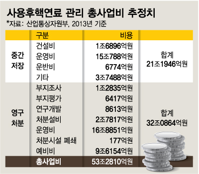 정부는 2013년 사용후핵연료 관리 총 사업비를 53조2810억원으로 추정했다. 산술적으로 물가상승률만 반영해도 지난해말 기준 56조7771억원에 달한다. 정부는 사업자인 한국수력원자력에 사용후핵연료 다발당 경수로는 3억2000만원, 중수로는 1320만원씩 부담금을 적립하도록 하고 있다. 지난해 말까지 실제 적립된 ‘사용후핵연료 관리 부담금’은 3조9763억원이다.