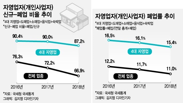 또한 자영업자의 영업환경이 얼마나 우호적인지 가늠해볼 수 있는 자영업자 신규-폐업 비율이나 폐업률 지표도 2년 연속 개선된 것으로 나타나 자영업 폐업 쓰나미가 온다거나 자영업이 다 망한다는 일각의 주장이 틀렸음을 보여주고 있다.