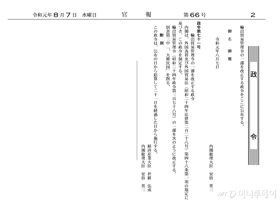 일본은 7일 한국을 '화이트리스트(백색국가·수출심사 우대국)'에서 빼면서 시행세칙인 '포괄허가취급요령'도 함께 개정했다. 기존 '백색국가'와 '비(非)백색국가' 구분을 없애고 수출 대상국을 A·B·C·D 4개 그룹으로 재분류하는 게 주요 내용이다.