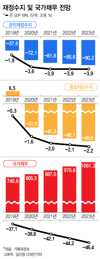 이처럼 정부가 강력한 지출 구조조정 의지를 내비친 것은 내년 예산이 사상 처음으로 500조원을 돌파하고 통합재정수지가 2009년 글로벌 금융위기 극복 과정이후 가장 많은 31조5000억원 적자를 기록하게 돼서다. 국민연금 보험료 등 사회보장성기금 수지를 뺀 관리재정수지는 국내총생산(GDP) 대비로 3.6%까지 치솟는다.