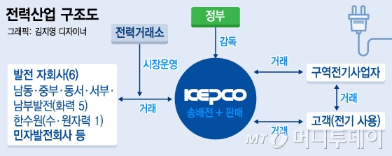 국내 전력산업은 한전 그룹이 사실상 독점하고 있다. 발전 부문은 한전 6개 발전자회사 점유율이 80%를 넘고 송·배전 부문은 한전이 100% 독점한다. 판매 부문도 한전을 제외한 10개 구역전기사업자 비중이 1%에도 미치지 못한다. 이 기형적 구조 때문에 '한전의, 한전에 의한, 한전을 위한 전력산업'이라는 비판도 나온다.