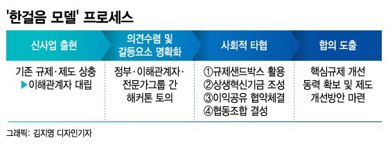 한걸음 모델에 따르면 새로운 사업이 출현할 때 기존의 규제·제도와 상충하면서 이해관계자 대립이 생기면 정부와 이해관계자, 전문가그룹간 해커톤 토의를 실시한다. 이후 사회적 타협 과정을 통해 △규제샌드박스 활용 △상생혁신기금 조성 △이익공유 협약체결 △협동조합 결성 등의 타협점을 찾는다. 합의가 도출되면 이에 따라 핵심규제를 없앨 동력을 확보하고 제도개선방안을 마련한다.