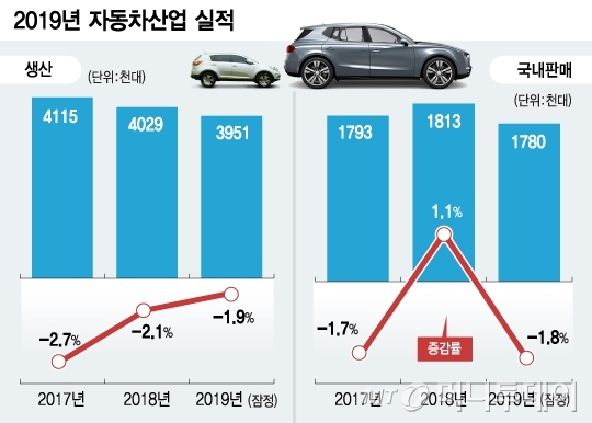 16일 산업통상자원부가 발표한 '2019년 자동차산업 연간 동향'에 따르면 국내 자동차 생산대수는 전년대비 1.9% 감소한 395만1000대로 잠정 집계됐다. 자동차 생산 400만대선이 깨진 것은 글로벌 금융위기가 있었던 2009년(351만3000대) 이후 10년 만이다.
