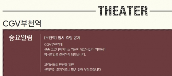 CGV 부천역점은 1일 오후 7시쯤 극장을 닫고 임시휴업에 들어갔다. 12번째 신종 코로나바이러스 확진자가 영화관을 찾은 것이 확인돼서다.