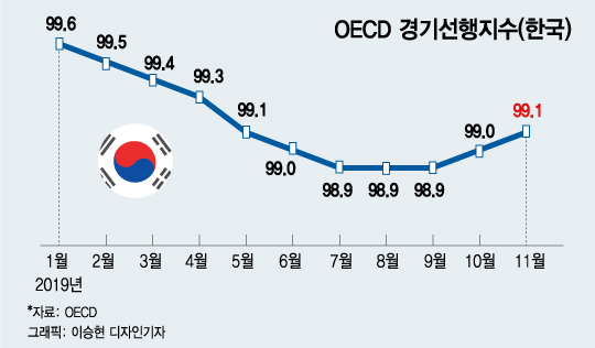 OECD 경기선행지수는 통상 6개월 이후의 경기 흐름을 예측하는 지표로 기준치 100을 기준으로 100 미만에서 하락세이면 경기 침체, 100 미만에서 상승세를 나타내면 경기 회복 국면에 진입할 것으로 해석된다. 따라서 지난해 말 경기선행지수가 100 미만에서 3개월 연속 상승세를 나타낸 한국 경기는 올해 상반기에 경기 회복을 나타낼 것으로 예상할 수 있다.