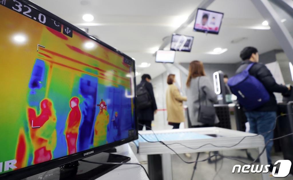24일 오전 9시 세종시 정부세종청사 13-1동 1층 출입구. 보안검색대와 스피드게이트(자동인식 출입 시스템) 사이 설치된 열화상카메라가 출입자들의 발열 여부를 실시간 확인했다.