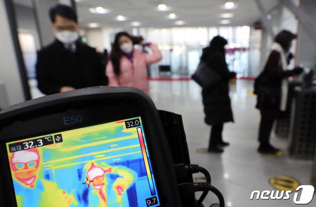 24일 오전 8시40분 세종시 정부세종청사 13-1동 1층 출입구, 공무원들의 출근길을 열화상카메라가 맞이했다. 보안검색대와 스피드게이트(자동인식 출입 시스템) 사이 설치된 카메라는 지나는 이들의 발열 여부를 실시간으로 확인했다. 주출입구가 아닌 13-2동 출입구에선 청원경찰이 체온계로 직접 모든 출입자의 체온을 재느라 길게 줄이 늘어섰다. 청사 내 휴게실, 다목적실, 체력단련실, 동호회실 등은 잠정 폐쇄됐다. 주말 사이 감염병 위기단계가 '심각'으로 격상되자 대응 강화 차원에서 이뤄진 조치다.