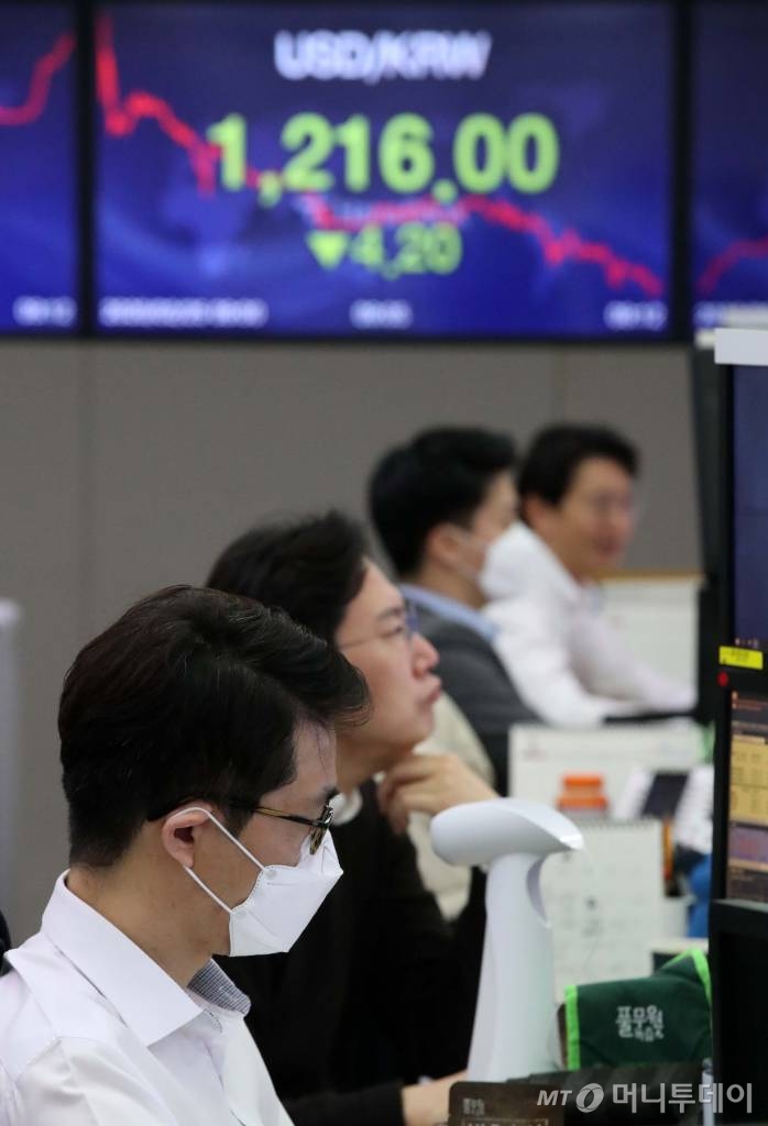 25일 서울 외환시장에서 원/달러 환율은 오후 2시 29분 현재 전 거래일보다 8.5원 내린(원화가치 상승) 1211.7원에 거래중이다.