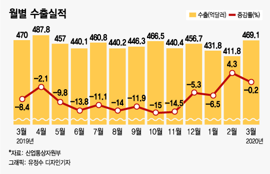 산업통상자원부는 지난달 수출액이 469억1000만달러로 지난해 3월 470억달러에 비해 0.2% 감소했다고 밝혔다. 수출액은 지난해 10월 저점 이후 회복세를 이어가며 올 2월에 플러스로 전환했지만 3월들어 코로나19 영향이 본격화되면서 소폭 감소했다. 일평균 수출액은 19억5400만달러로 6.4% 감소했다. 두자릿수(11.9%) 감소했던 2월보다는 나아진 모습이다.