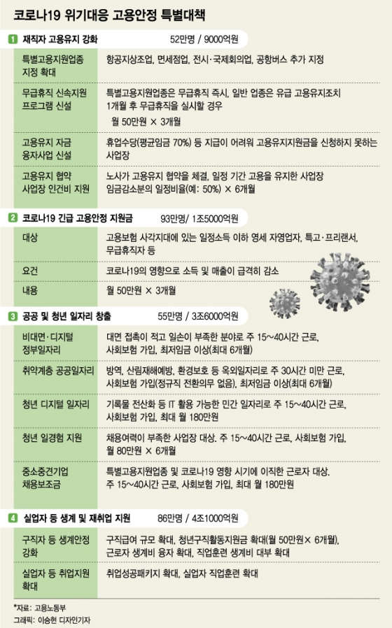 특별대책은 △재직자 고용유지 강화 △긴급 고용안정 지원금 △공공 및 청년일자리 창출 △실업자 등 생계 및 재취업 지원 등 4개 범주로 구성됐다.