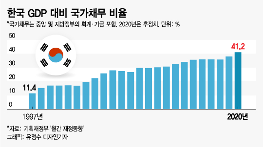 2019년 기준 한국의 국가채무(D1)는 중앙정부(699조원)와 지방정부(29.8조원) 합쳐서 728조8000억원으로 국내총생산(GDP) 대비 38.1%였다. 올해 추경을 포함한 중앙·지방정부 채무액은 815조5000억원으로 GDP 대비 41.2%(+3.1%p 증가)로 올라갈 것으로 추정된다.
