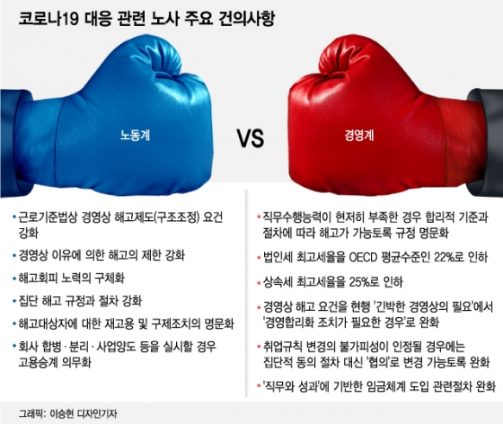 아직 코로나19를 두고 노사는 평행선을 달리고 있다. 현실에 대한 견해 및 해법 등을 놓고 견해차가 크다. 경영계는 코로나19를 극복하기 위해 기업들에 대한 긴급한 자금 지원과 함께 '쉬운해고'와 '취업규칙 변경 완화' 등을 요구한다.
