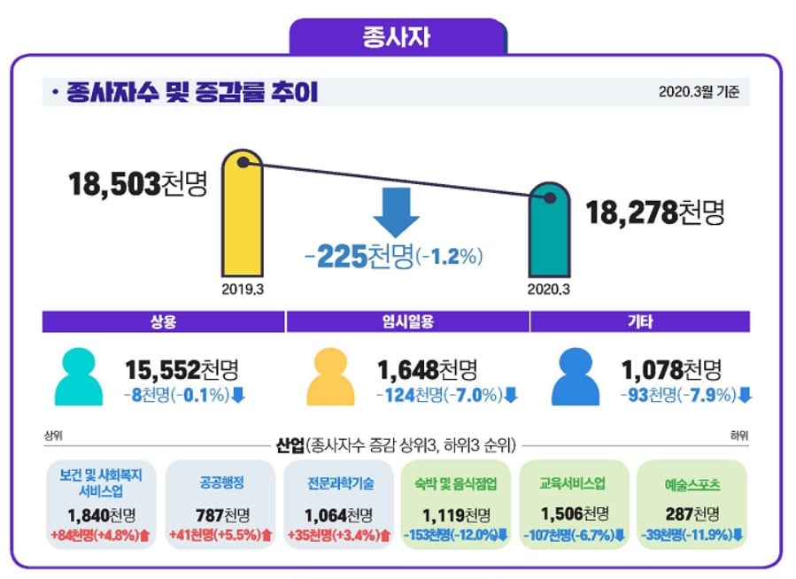 코로나19 충격은 취약계층 고용뿐 아니라 질 좋은 일자리에까지 영향을 미치고 있다. 지난달 임시일용 노동자, 기타종사자는 각각 12만4000명, 9만3000명 줄었다. 이에 더해 지난 2월 16만명 넘게 늘었던 상용노동자도 지난달 8000명 감소했다. 상용노동자가 감소한 건 사상 처음이다.