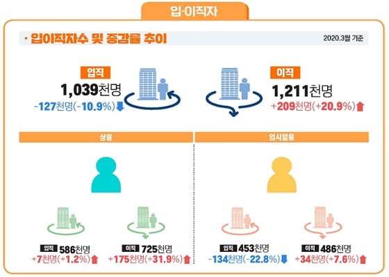 입·이직자 통계도 고용 위축을 보여준다. 지난달 입직은 103만9000명으로 전년보다 12만7000명 감소했다. 반면 이직은 20만9000명 증가한 121만1000명으로 집계됐다. 통상 3월은 신규채용이 마무리 돼 입직이 이직보다 많다. 하지만 코로나19 여파로 채용은 줄고 일터를 떠나는 사람이 늘면서 이직이 입직을 앞질렀다.