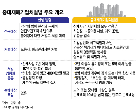 '끊이지 않는 산재사고'에 노동계의 중대재해기업처벌법 제정을 촉구하는 목소리가 커지고 있다. 경영계는 전과자 양산 부작용, 과잉형벌의 문제 등을 지적한다. 노동계와 경영계가 분명한 입장차이를 보이고 있어 '힘겨루기'가 치열할 전망이다.