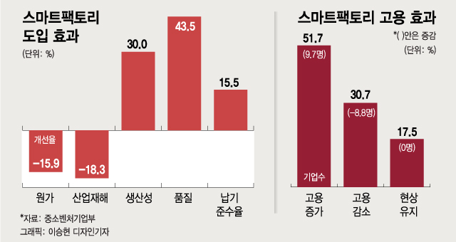 중기부에 따르면 기업이 스마트공장을 구축하면 지난해말 기준으로 원가와 산업재해는 각각 15.9%, 18.3% 감소하고 △생산성(30%) △품질(43.5%) △납기준수율(15.5%) 등도 개선 효과가 뚜렷하다. 생산성이 좋아지자 줄어들것 같았던 일자리는 되려 늘었다. 2016년 조사에서 스마트공장 구축 기업 가운데 51.7%에 해당하는 기업의 고용이 평균 9.7명 늘었다. 반면 일자리가 줄어든 기업은 30.7%에 그쳤다. 이들 기업에서는 평균 8.8명이 감소했다. 17.5%는 현상 유지했다. 결과적으로는 기업당 평균 2.2명 늘어난 셈이다.