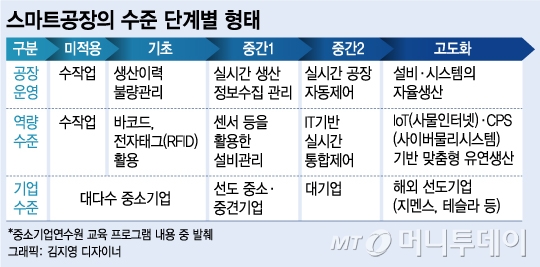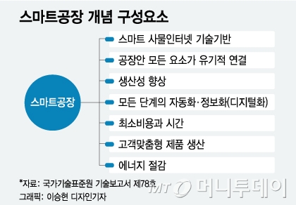 한국의 스마트 팩토리 수준은 삼성전자 등 일부 대기업을 제외하면 생산공정을 단순 제어하는 초보 수준에 그친다. 스마트 팩토리 관련 기술력도 취약해 대부분 외국산 제품에 의존한다. 응용 솔루션 분야도 생산관리시스템(MES), 공급망관리(SCM) 등 소프트웨어 기술은 선진국의 70∼90% 수준까지 따라 잡았지만 제품수명주기관리(PLM)나 센서, 로봇 같은 핵심기술은 선진국에 한참 뒤처진다.