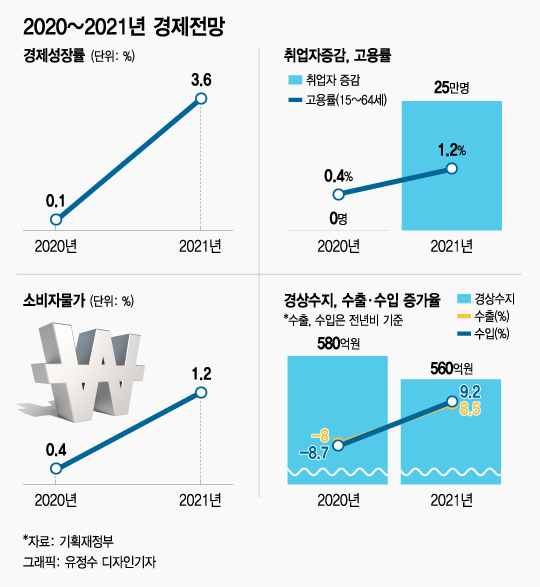 정부가 올해 한국 경제 성장률을 0.1%로 전망했다. 외환위기 때였던 1998년(-5.1%) 이후 22년 만에 가장 낮은 수준이다. 그나마 대대적 재정투입, 규제완화로 마이너스 성장을 막겠다는 의지가 담긴 '목표'에 가까운 수치다. 수출입, 고용, 소비 등 올해 주요 경제지표도 부진이 불가피할 것으로 내다봤다.