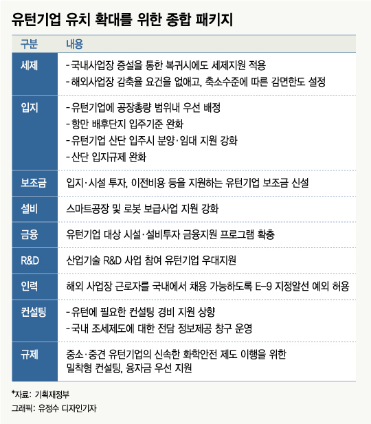 아울러 현재는 해외사업장 생산량을 50% 이상 감축하는 유턴 기업에 대해서만 법인세·소득세 감면이 이뤄졌지만, 앞으로는 이 조건을 없애는 등 세제 지원도 강화한다. 또 현재는 유턴기업에 대해 100원을 보조금으로 지급하는데, 앞으로는 비수도권은 200억원을, 수도권은 첨단산업에 한정해 150억원을 지원한다.
