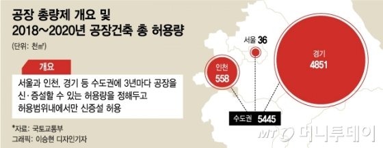 이중 기업들이 투자를 망설이하게 하는 가장 부담스러워 하는 규제는 수도권 공장총량제다. 1982년 제정한 수도권정비계획법에서 도입한 공장총량제는 서울·인천·경기 등 수도권에 3년 단위로 일정 면적을 정해두고 해당 범위 안에서만 연면적 500㎡ 이상 공장의 신·증설을 허용하는 제도다. 과밀억제권역의 경우 공업지역의 위치변경만 가능하고 면적을 늘릴 수는 없다.